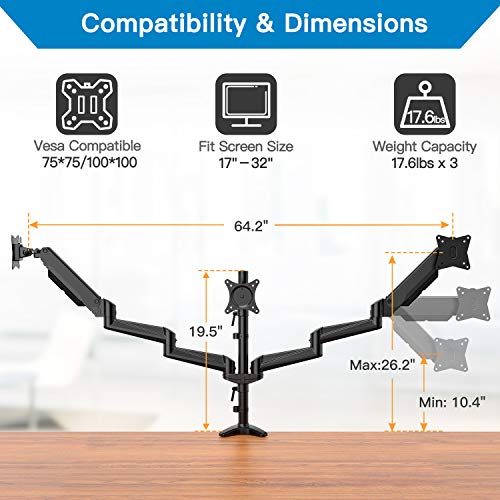 Get your Triple Monitor Stand - Full Motion Articulating Aluminum Gas Spring Monitor Mount Fit Three 17 to 32 inch Flat/Curved LCD Computer Screens with Clamp, Grommet Kit, Black - ONLINE ONLY here today at the official site. Look around for more while you're here.
